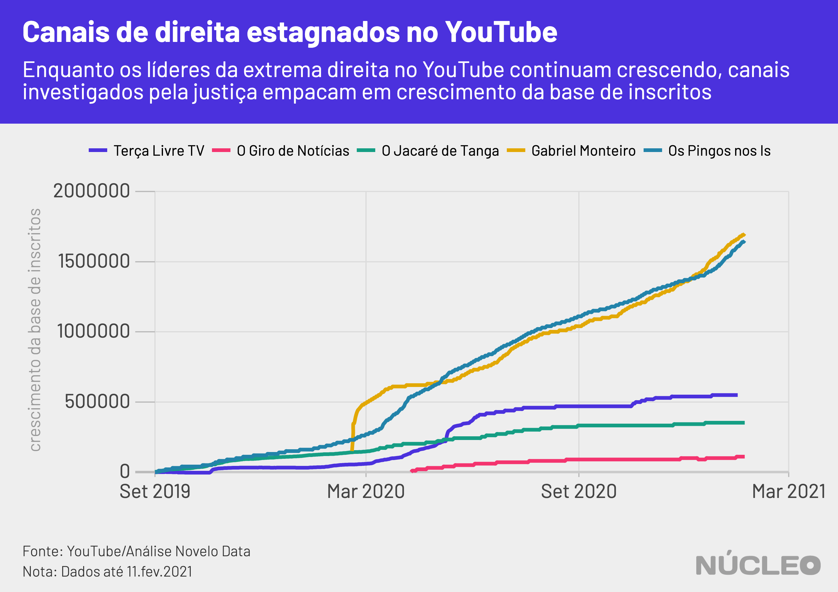 A proximidade da Justiça impacta diretamente a capacidade desses canais de continuarem a crescer suas bases. Após a operação, o Terça Livre passa por uma rápida expansão de novos assinantes, para depois empacar a partir de julho. O mesmo acontece com O Giro de Notícias e outro canal na mira da Justiça, O Jacaré de Tanga, alvo da CPMI das fake news instalada no Congresso Nacional em setembro de 2019.